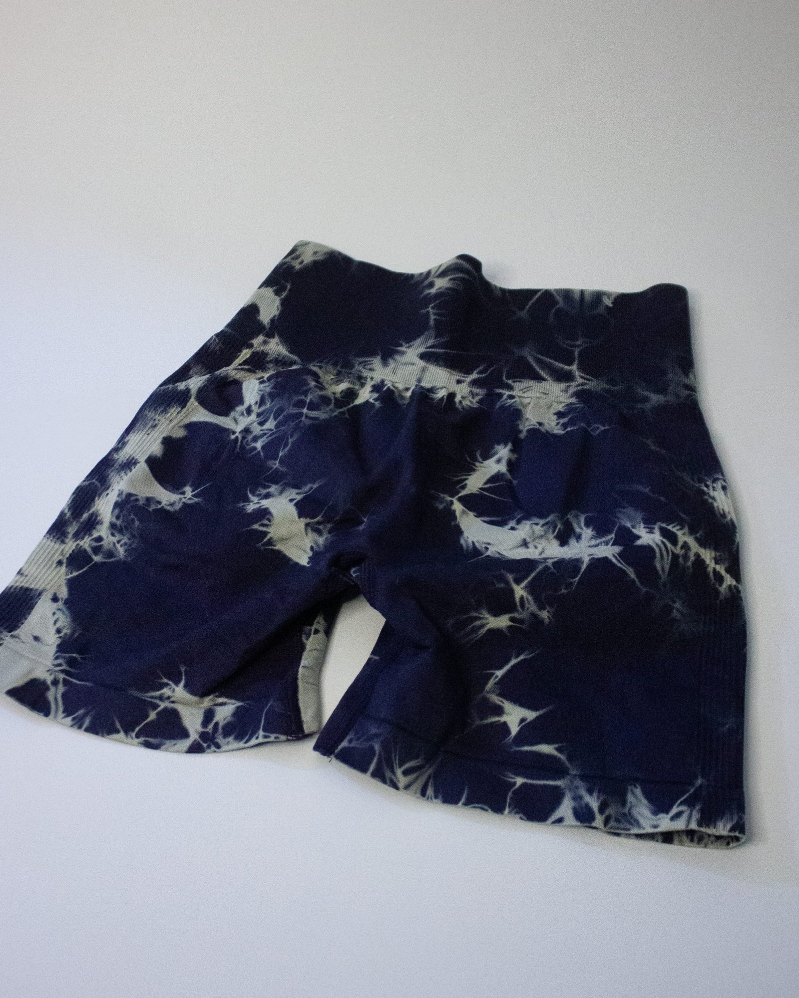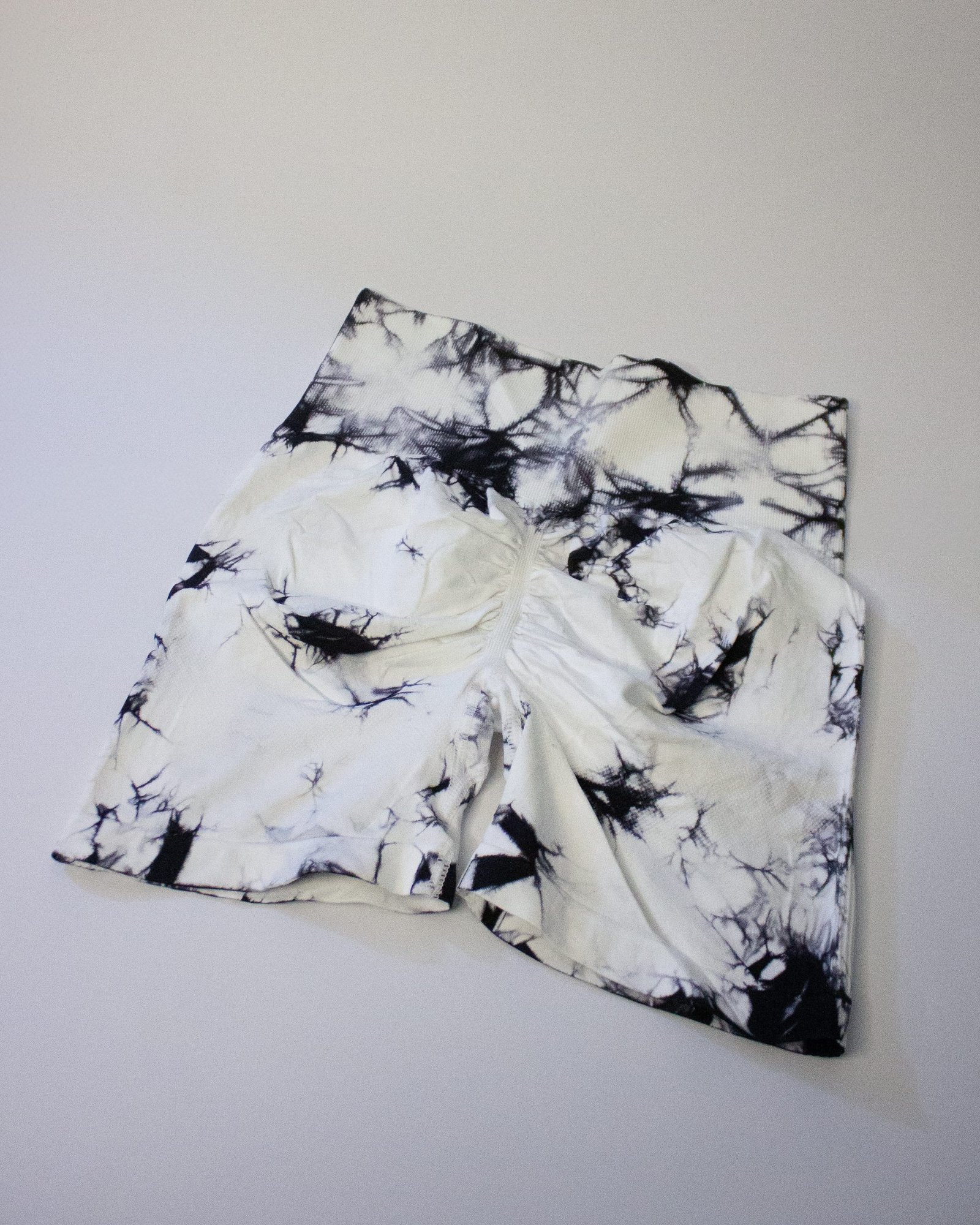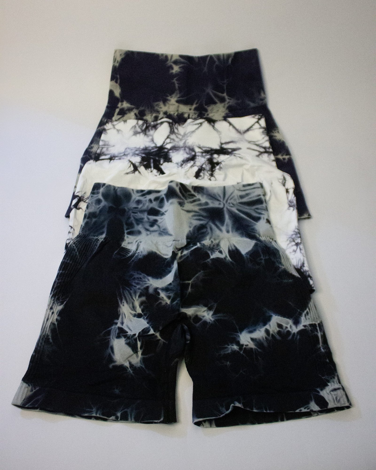 Pack de tres shorts estilo ciclista con teñido tie-dye en tonos blanco, gris y negro.